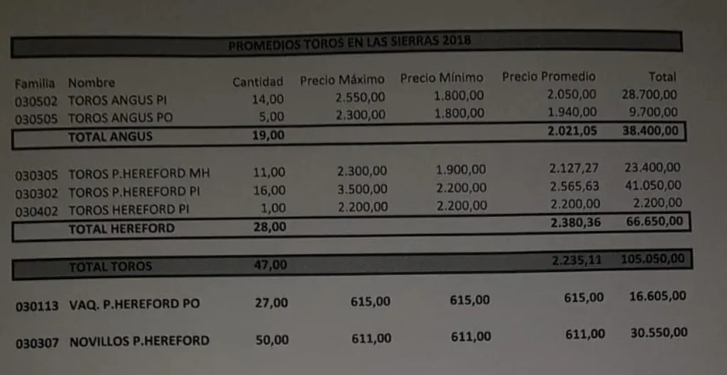 Además, los 19 Angus se comercializaron a US$ 2.021, con US$ 2.550 de valor máximo. Las 27 vaquillonas HS promediaron US$ 615 y los 50 novillos Hereford US$ 611.