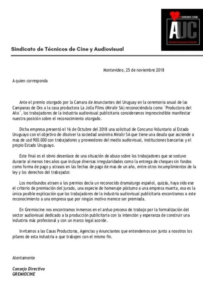 Respecto al reconocimiento como Productora del Año en la Campana de Oro, desde la Cámara de Anunciantes se informó que el plazo para presentar las piezas fue entre el 27 de agosto y el 14 de setiembre, antes de la fecha en que se presentó el concurso. Explicaron que se enteraron de la situación que está atravesando la productora a través del comunicado de GremioCine.