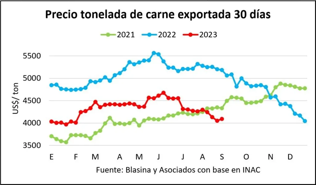 Cierre semanal de mercados. El precio de exportación repuntó la semana pasada para la carne vacuna pero el promedio a 30 días sigue flojo. Quedó en US$ 4.096, de acuerdo a los datos provisorios del Instituto Nacional de Carnes (INAC), por debajo del promedio anual de US$ 4.355.