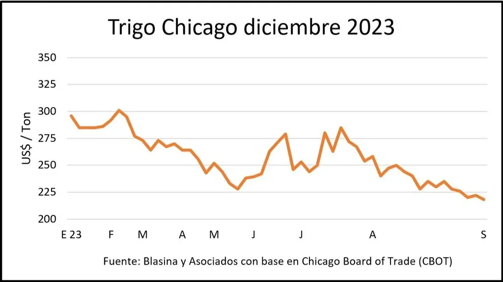 El trigo posición diciembre tuvo altibajos y cerró la semana en US$ 218 por tonelada, ajustando US$ 10 respecto al viernes pasado, una corrección a la baja de más de 4%.