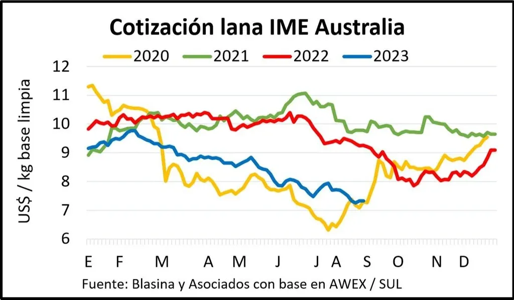 El Indicador de Mercados del Este (IME) subió US$ 0,06 respecto a la semana pasada con pujas por los lotes en todo el rango de finuras y cerró a US$ 7,32 por kilo base limpia. La presión de la demanda aflojó en la segunda jornada, a lo que se sumó la apreciación de la moneda local y los precios no consiguieron mantener la tónica alcista. El indicador se mantuvo estable. Este ligero fortalecimiento del dólar australiano derivó en una suba algo menor del indicador en la divisa local.