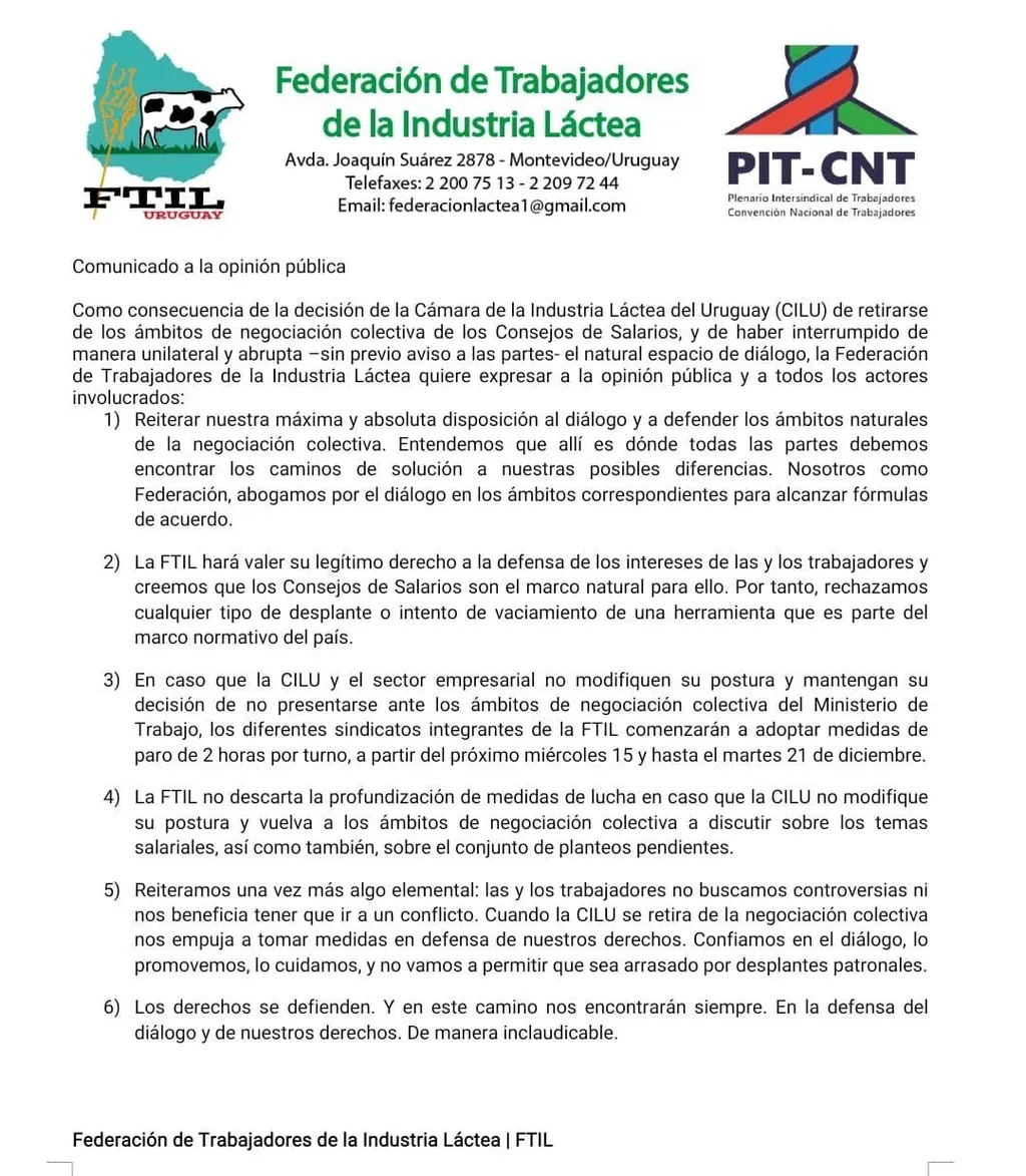 La Cámara de la Industria Láctea del Uruguay (CILU) se retiró de la negociación salarial que sostenía con la Federación de Trabajadores de la Industria Láctea (FTIL) y dada esa decisión la gremial implementará paros de dos horas por turno en todas las industrias del país y en diferentes sectores, a partir del miércoles 15 y hasta el martes 21 de diciembre, informó a El Observador Enrique Méndez, integrante de la FTIL.