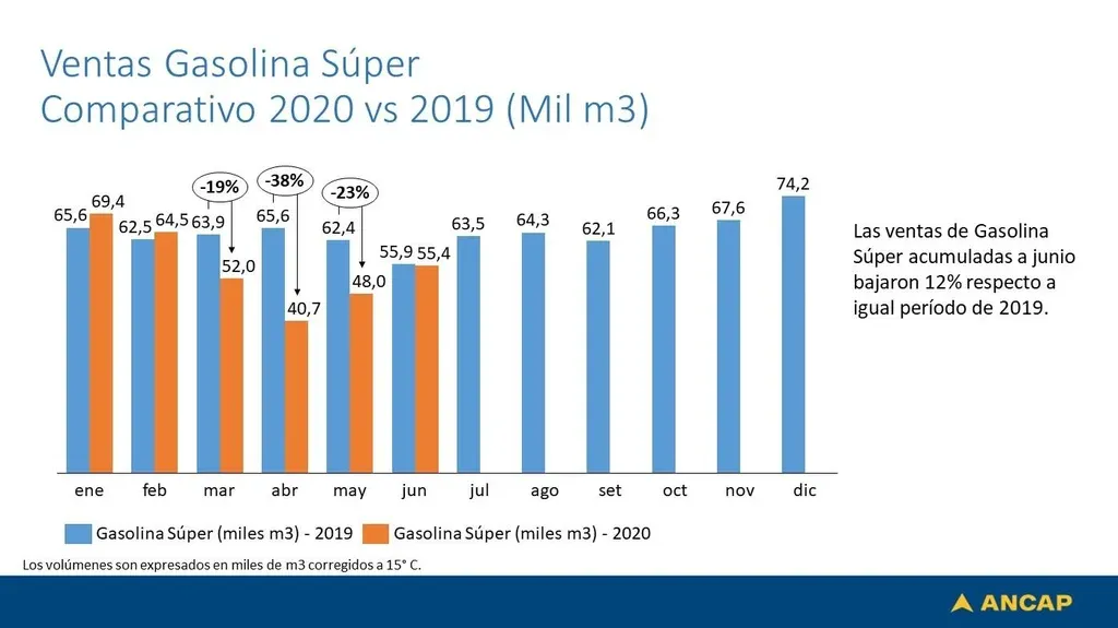 Por otro lado, la venta de gasolina Súper -la de mayor demanda en Uruguay- prácticamente cerró estable en junio con 55.400 m3 (en igual mes del año pasado habían sido 55.900 m3). No obstante, en este caso se dio una notoria diferencia con los desplomes de 19%, 38% y 23% que registraron marzo, abril y mayo, respectivamente, en la comparación interanual. En el primer semestre, el volumen comercializado de este tipo de gasolina cayó 12% frente a 2019.