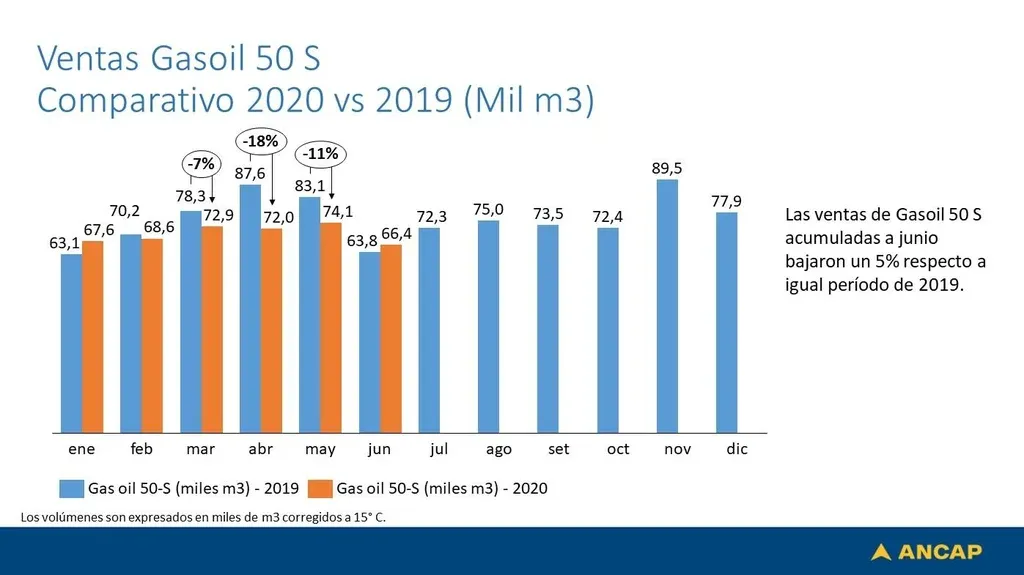La venta de gasoil 50 S de Ancap totalizó 66.400 metros cúbicos (m3) en junio, volumen que pautó un crecimiento del 4% respecto a igual del año pasado. Esa foto marcó un claro contraste respecto a las caídas de marzo (7%), abril (18%) y mayo (11%), según datos que publicó el ente petrolero en su red social Twitter ese lunes.