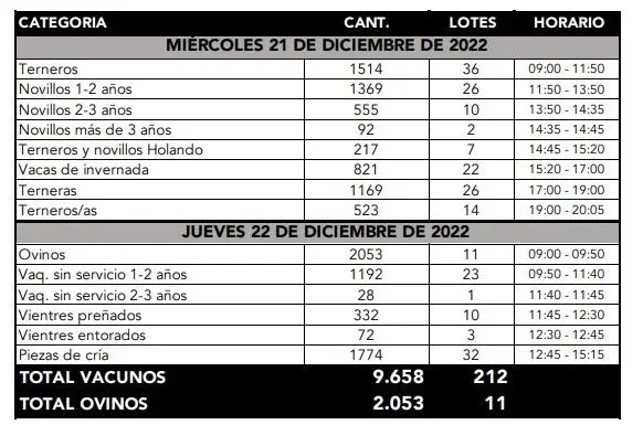 Los escritorios socios alistaron una oferta de 9.658 vacunos y 2.053 ovinos. En la misma se destacan ganados de “excelente calidad”, entre ellos terneros, novillos y piezas de cría, categorías muy demandadas actualmente, dijo y agregó: “Me parece que es la última oportunidad de hacerse una oferta de volumen, por el parate en los negocios por las fiestas y licencias”.