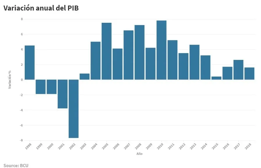 El último dato de crecimiento trimestral se registró en el período enero-marzo de 2018. Pero si bien la expansión económica no se detuvo, a partir de 2015 las tasas de crecimiento se asentaron en promedio por debajo del 2% anual, lejos de los niveles registrados a partir de 2004, y con sectores relevantes de actividad como el complejo agroexportador, la construcción o la industria manufacturera con serias dificultades.