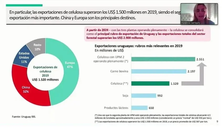 La economista detalló que las ventas al exterior de 2019 significaron “más del 16% de las exportaciones de bienes uruguayos” y que del total de lo que ingreso US$ 1.500 millones fueron por celulosa, a la vez que entre madera acerrada, terciada, chips y madera en rolos se vendió por US$ 370 millones.