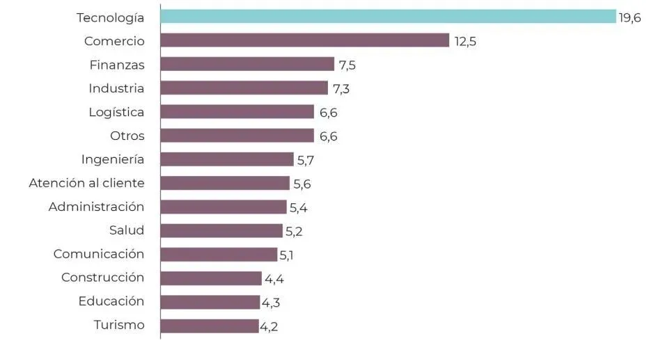 Dentro de esa base de datos, el monitor diferenció 10.757 (27%) llamados que se encuentran estrechamente vinculados al sector TI. Al separarlos por rama de actividad, se desprende que el sector de las tecnologías constituye el área más importante en la actividad de los portales. Uno de cada cinco llamados proviene de este sector.