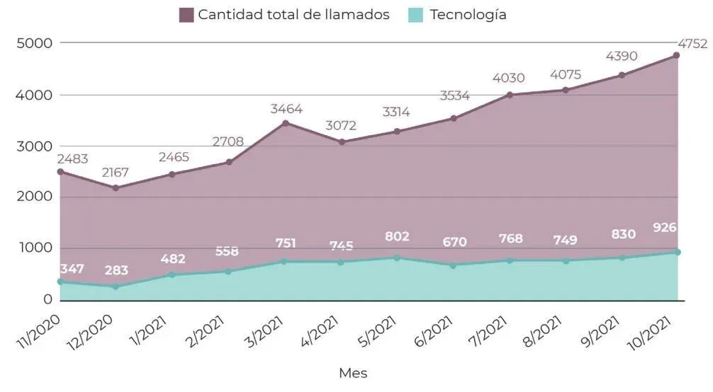 Cantidad de llamados totales y cantidad de llamados vinculados a tecnología. Período noviembre 2020-octubre 2021 (%)
