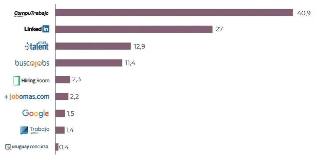 Computrabajo es el portal que cuenta con más proporción de llamados, en el entorno del 41%. En segundo lugar se encuentra Linkedin nucleando aproximadamente la cuarta parte de los llamados, seguido de Smart Talent y Buscojobs en el entorno del 12%.