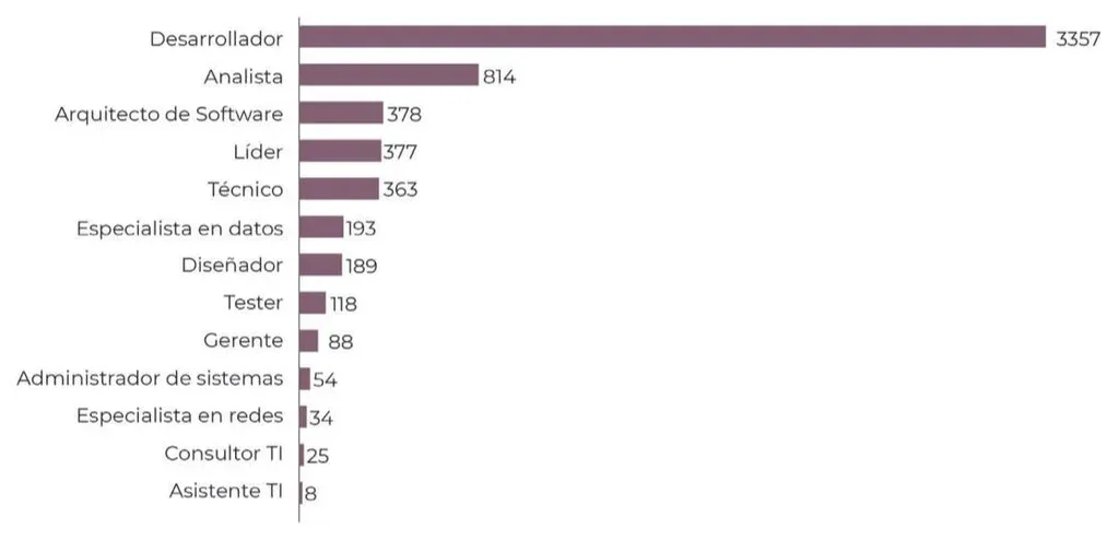 El perfil más demandando en el relevamiento es el de desarrollador, constituyendo más de la mitad de esta demanda (3.357 llamados). Lo siguen el de analista, conformando casi un 13% (814) de los llamados a cargos TI por parte de las empresas del sector y arquitecto de software (378) nucleando el 6% de esta demanda.