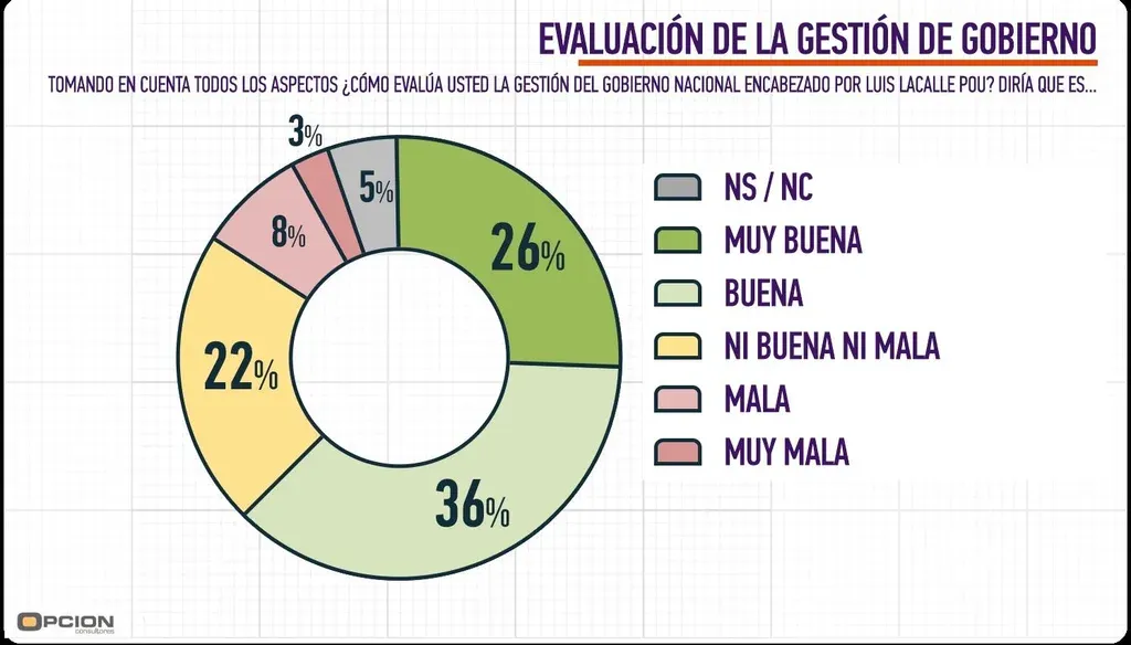 "El gobierno recoge un saldo evaluativo ampliamente favorable, con algo más de seis de cada 10 uruguayos que aprueba su gestión y algo menos de uno de cada 10 que la desaprueba", afirma la investigación de la consultora.