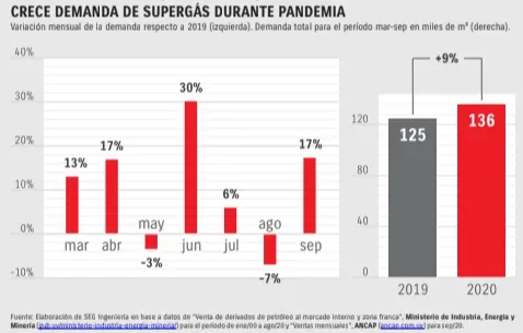 En primer lugar, se presenta el caso del gas licuado de petróleo (GLP) o más conocido como supergás. Utilizado por el 91% de los hogares para cocción de alimentos y por el 24% para calefaccionar las viviendas, según la Encuesta Continua de Hogares 2019 del Instituto Nacional de Estadística (INE), durante los meses de pandemia la demanda de supergás creció 9% si se la compara con los registros de 2019 y 9,6% con los del quinquenio 2015 a 2019, siendo el único energético que registró un crecimiento en la demanda, según SEG.