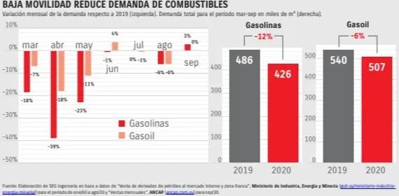 Un fenómeno fácilmente apreciable en las calles al momento de decretarse la emergencia en Uruguay fue la caída en la movilidad. A mediados de abril, el informe elaborado por la Intendencia de Montevideo dio cuenta de ese fenómeno señalando que en la comparación del movimiento de vehículos en puntos de la ciudad que abarcan la mayoría de las zonas urbanas entre los días 9 de marzo, previo a la emergencia sanitaria, y el día 23 del mismo mes se constató una retracción en el tráfico de vehículos del 40%. Este descenso en el tránsito generó la consecuente merma en el consumo de gasolinas y gasoil.