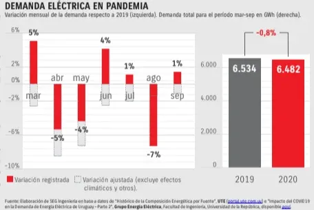 No obstante, también se presentan, en líneas punteadas y sombreado gris, las variaciones en la demanda eléctrica según el trabajo Impacto del covid-19 en la Demanda de Energía Eléctrica de Uruguay – Parte 2 realizado por el Grupo Energía Eléctrica de la Facultad de Ingeniería de la Universidad de la República. Este resultado es más preciso, ya que aísla los efectos de la pandemia excluyendo entre otros las diferencias climáticas entre los años.