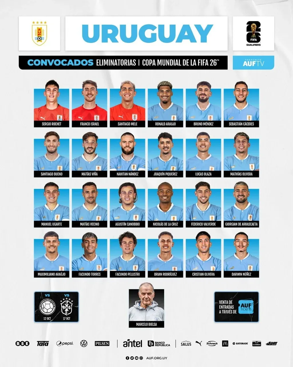 Marcelo Bielsa dio la lista de 24 convocados de la selección uruguaya para los próximos partidos ante Colombia y Brasil por las Eliminatorias 2026.