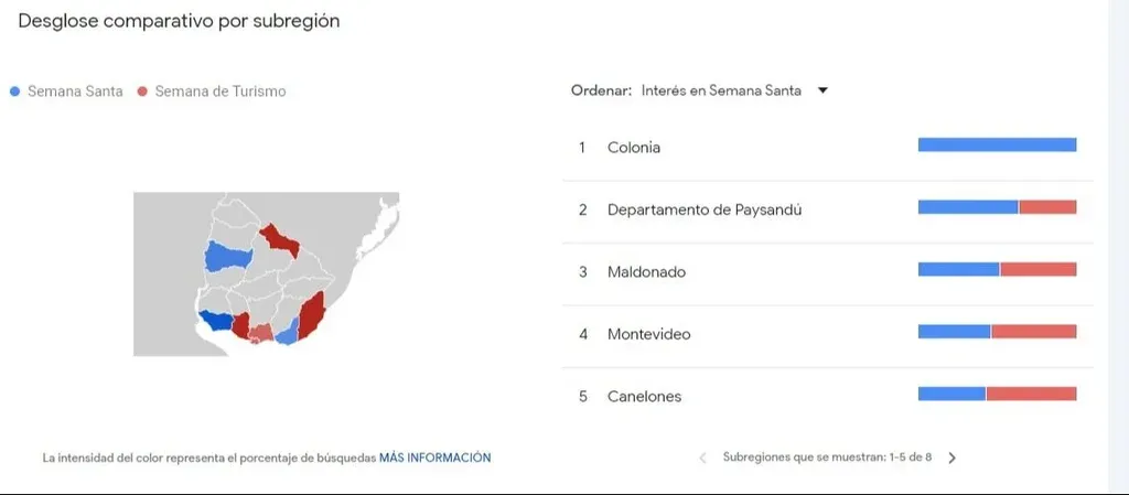 El informe también muestra los departamentos que prefirieron más un término por encima del otro: en Colonia y Maldonado se prefiere buscar como Semana Santa, mientras que en el resto de los departamentos como semana de Turismo.