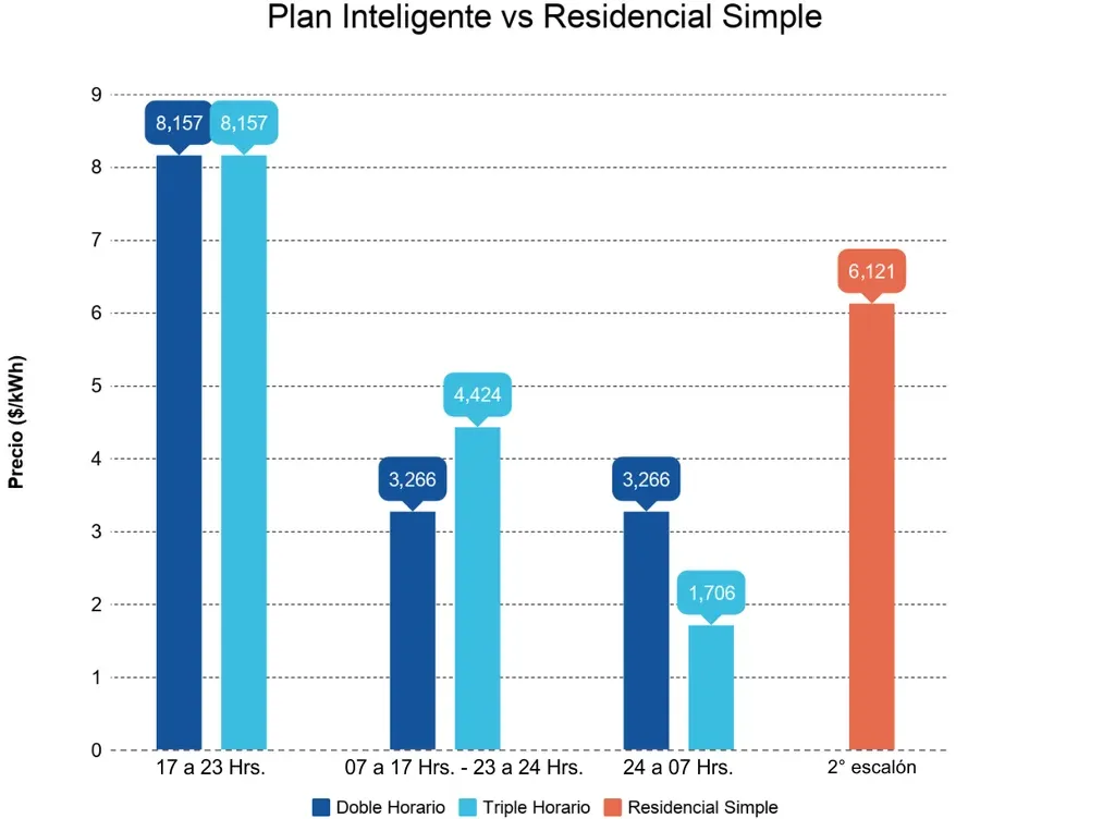En esta gráfica puedes observar un comparativo de precios de las tarifas del plan Inteligente, frente al precio del segundo escalón de la tarifa residencial simple. Durante 18 horas al día, el plan Inteligente tienen un precio más conveniente que el segundo escalón de la tarifa residencial simple. Se compara con este escalón, porque es donde se registra la mayor cantidad de consumo de los clientes con esta tarifa.