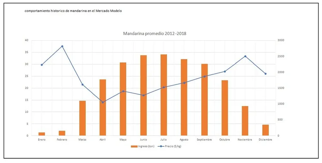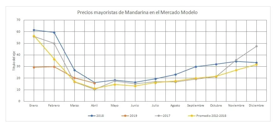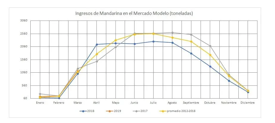 Considerando el volumen de ingresos de productos frutícolas y hortícolas al Mercado Modelo durante todo 2018, medido en toneladas, la mandarina ocupó el séptimo puesto del ránking con un 5%, por debajo de los rubros papa, banana, naranja, manzana, cebolla y zanahoria.