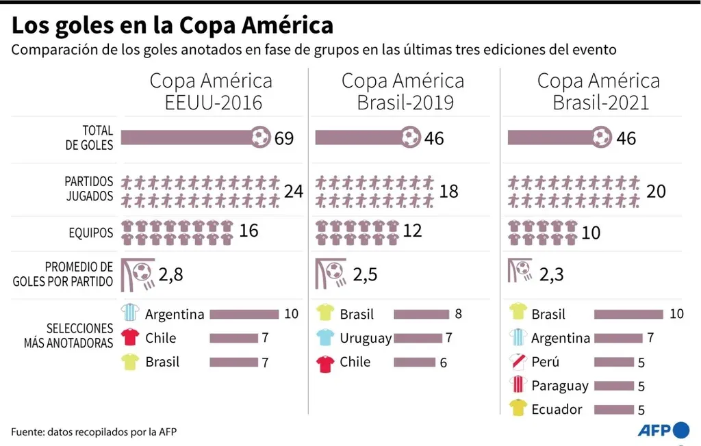 Pero ni el show de Lionel Messi en Cuiabá evitó que el torneo, al cierre de la fase de grupos, tenga su peor promedio ofensivo desde Chile 2015. Hasta ahora se han marcado 2,3 goles por partido, frente a 2,5 en Brasil 2019 y 2,8 en la Copa Centenario de Estados Unidos 2016.