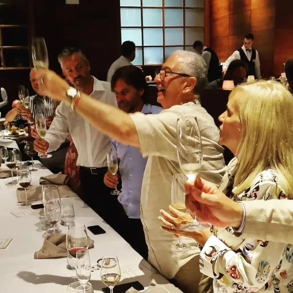 Marcelo Tinelli llegó al restaurante St. Tropez en el Enjoy Punta del Este después de visitar el salón del vino y preguntó qué era esa "mesa imperial". Le explicaron que era para los invitados de un cumpleaños: el 73 de Sergio Puglia. El emblemático presentador quiso entonces conocer en persona al cocinero, sobre quien ya tenía conocimiento.
