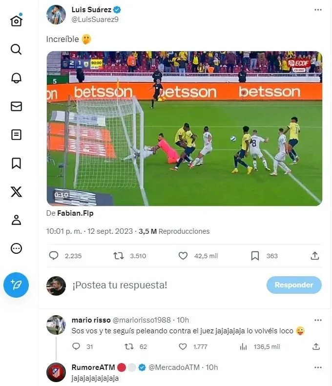 Luis Suárez se pronunció sobre la última jugada del partido Ecuador-Uruguay. El delantero que no fue convocado por Marcelo Bielsa para los primeros dos partidos de Eliminatorias posteó un video del golpe de Hernán Galíndez sobre Facundo Torres y se limitó a escribir: "Increíble".