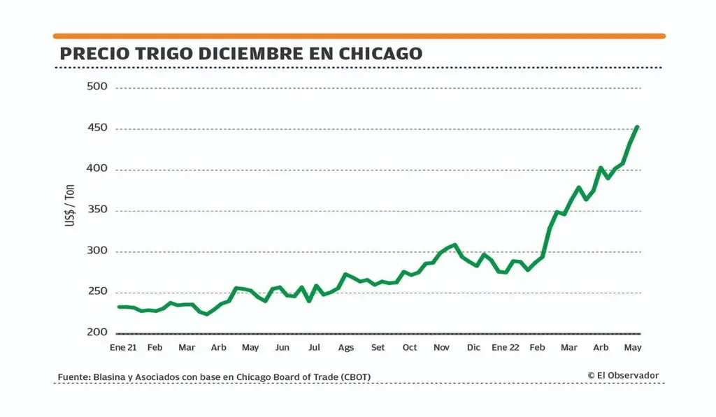 EO El jueves 12 los precios del trigo se habían disparado por encima de los US$ 430 la tonelada y el lunes llegaban a más de US$ 450. El martes llegó a US$ 460 por tonelada. El grano vale 55% más que hace un año y es el commoditie agropecuario que más aumentó en lo que va de 2022, solo por detrás de los combustibles fósiles, un aumento que acentúa la ya crítica situación de inseguridad alimentaria que ha generado el caos en Sri Lanka y disturbios en Irán.