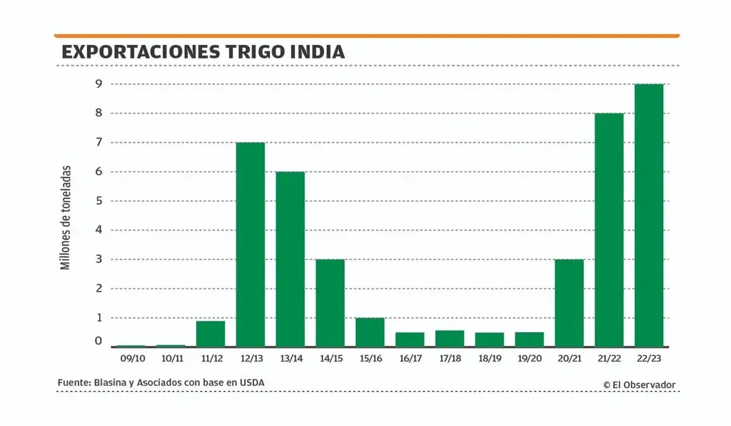 EO India estaba sustituyendo con exportaciones récord parte de la restringida oferta de Ucrania, con 20 millones de toneladas bloqueadas en sus puertos. Proyectaba vender 10 millones de toneladas este año y estaba abasteciendo a nuevos mercados hasta que una ola de calor afectó su cosecha, redujo la producción esperada y llevó los precios internos a máximos históricos.