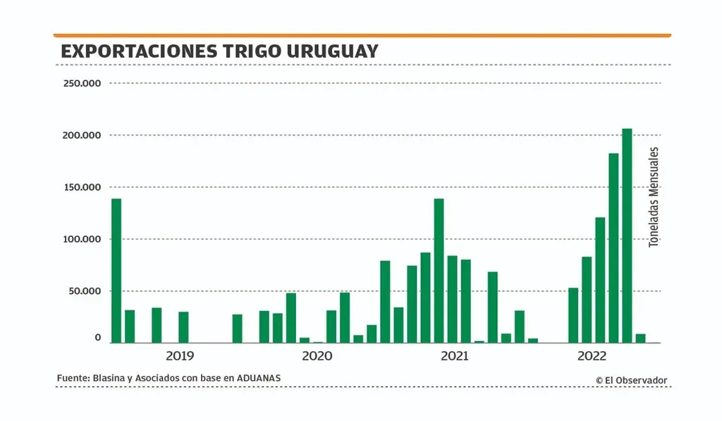 Desde que estalló la guerra la avidez por el grano fue tal y las exportaciones adquirieron tal ritmo que hay quienes creen que este año es posible que Uruguay tenga que importar trigo por primera vez en muchos años. Esta semana el gobierno redujo los aranceles para la importación de harina de trigo, aunque no de granos. En lo que va del año Uruguay exportó 70% más trigo que en el primer cuatrimestre de 2021, con el menor stock para mayo de los últimos 10 años.