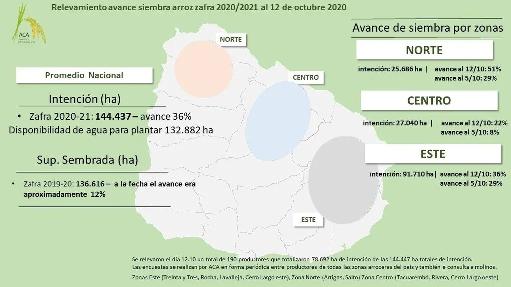 El lunes 12 de octubre, con base en el último reporte semanal divulgado por la gremial, se había alcanzado el 36% de siembra en el área estimada originalmente (144.437 hectáreas), no obstante se precisó que la disponibilidad del recurso agua era a esa altura suficiente para una siembra menor, en 132.882 hectáreas.
