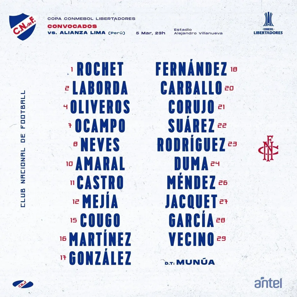 El probable equipo de Munúa es con Luis Mejía, Mathías Suárez, Guzmán Corujo, Mathías Laborda, Agustín Oliveros, Neves, Felipe Carballo; Brian Ocampo, Santiago Rodríguez, Gonzalo Castro y Vecino.