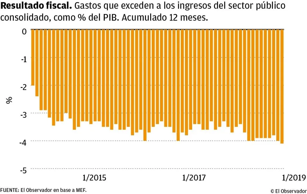 Los datos divulgados el jueves por el Ministerio de Economía y Finanzas (MEF) muestran que el déficit fiscal del sector público consolidado se ubicó en el equivalente a 2,7% del Producto Interno Bruto (PIB).