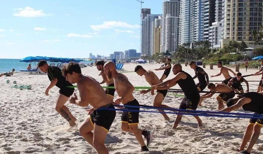 Los aurinegros concurrieron a la Sunny Isles Beach de Miami en donde realizaron todo tipo de ejercicios con y sin pelota.