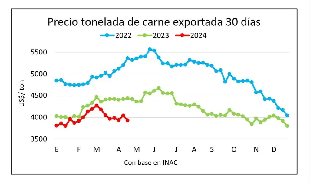 Blasina y Asociados. El precio de exportación de la carne vacuna quedó por debajo de los US$ 4.000 la tonelada, con un promedio en los últimos 30 días de US$ 3.930 por tonelada de acuerdo a los datos del Instituto Nacional de Carnes (INAC).