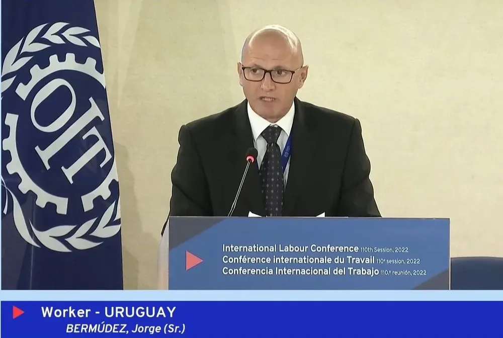 El representante del PIT-CNT, Jorge Bermúdez, se refirió este jueves en la 110° Asamblea de la Organización Internacional del Trabajo (OIT) a las políticas sociales desarrolladas por el gobierno en el marco de la pandemia y al proyecto del Poder Ejecutivo para modificar aspectos de la negociación colectiva.