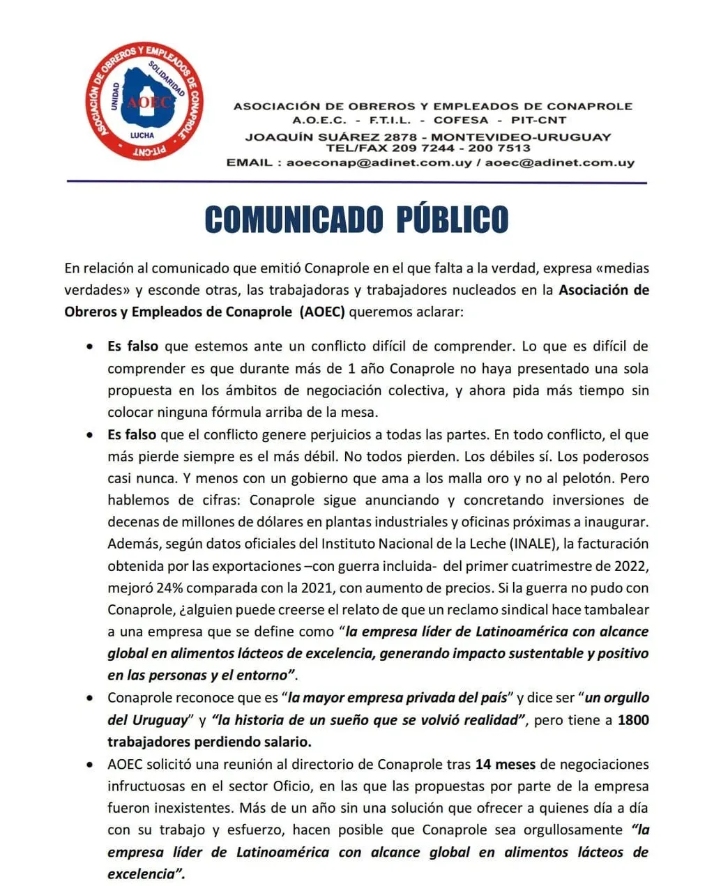 La Asociación de Obreros y Empleados de Conaprole (AOEC), en otra instancia que pone de manifiesto el estancamiento del conflicto sindical en la empresa, emitió un comunicado público en el que expone una serie de consideraciones a modo de respuesta a un comunicado que el directorio de Conaprole envió este jueves a su personal.