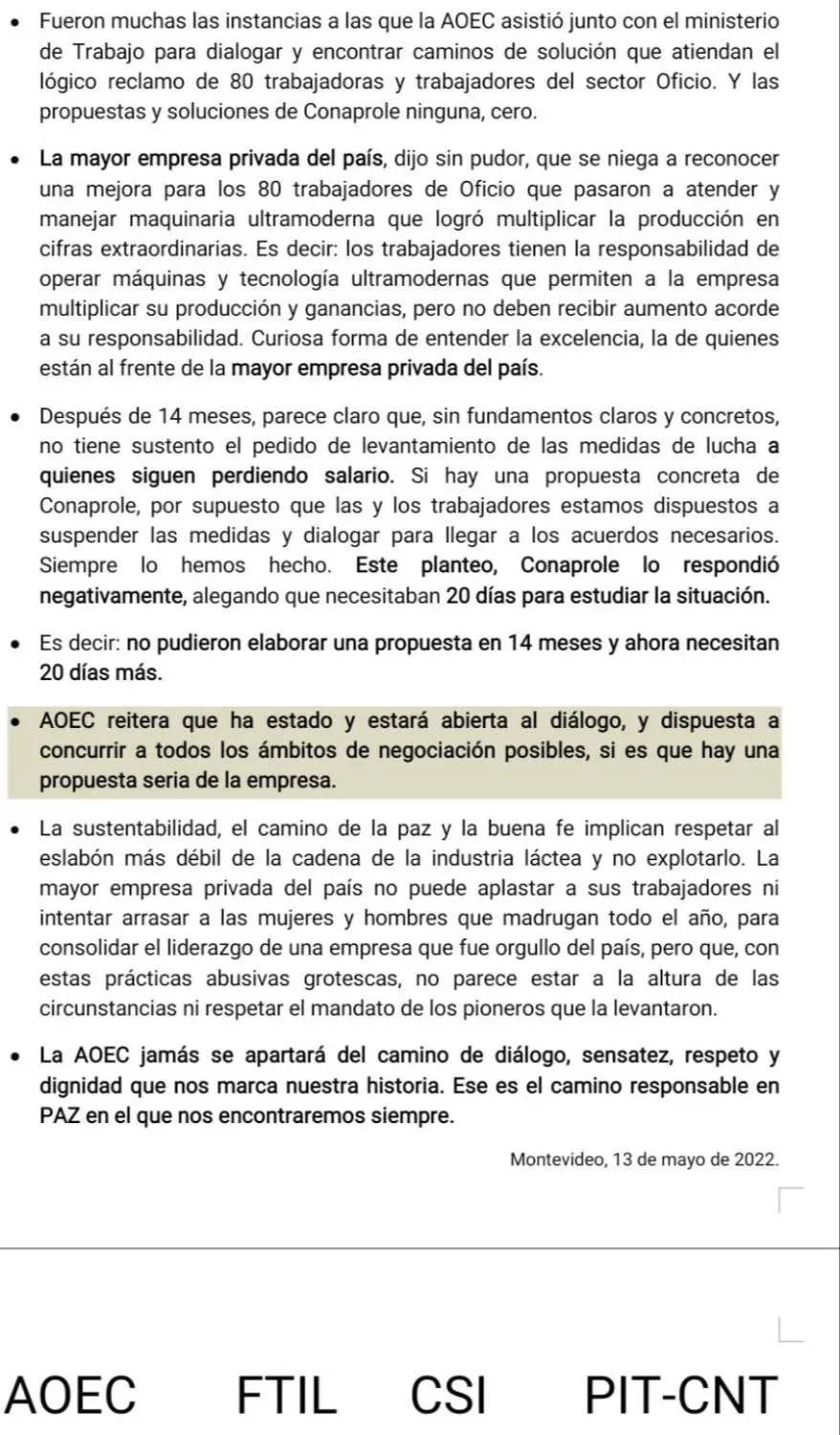 Sobre la discusión relacionada con el no acuerdo sobre un plazo para que Conaprole diseñe una propuesta con mejora salarial y cambios en las labores (la empresa pidió primero un mes y luego hasta fin de mayo, en tanto el sindicato quería se resuelva antes del 23 de mayo), el comunicado de AOEC expresa: "No pudieron elaborar una propuesta en 14 meses y ahora necesitan 20 días más".
