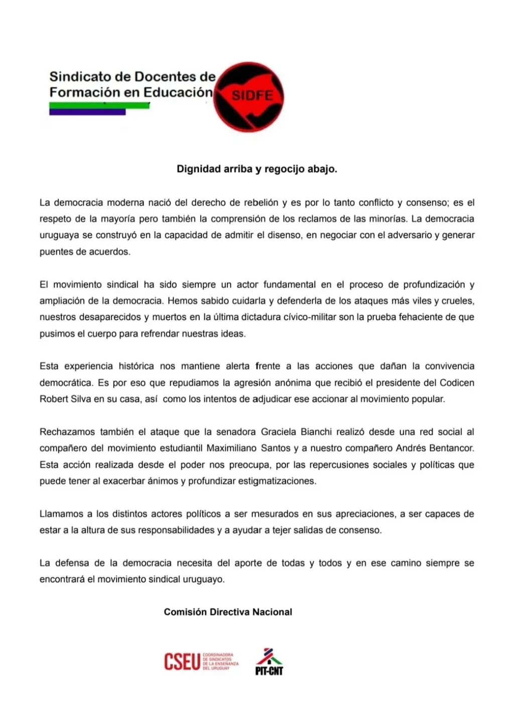 “Repudiamos la agresión anónima que recibió el presidente del Codicen Robert Silva en su casa, así como los intentos de adjudicar ese accionar al movimiento popular”, indica un comunicado difundido por el sindicato, en el que también se rechazan dichos de la senadora Graciela Bianchi.