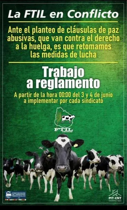 En ese marco, desde la Asociación de Obreros y Empleados de Conaprole (AOEC) se informó a El Observador que en ese caso se comenzará a trabajar "a reglamento" a partir de la hora 0 de este sábado 4 de junio.
