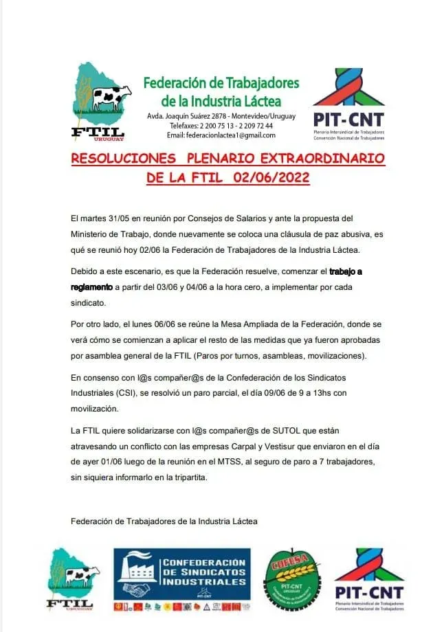 El plenario de este jueves se reunió luego de que el martes 31 de mayo, explica un comunicado de la FTIL, en una reunión en el marco de los Consejos de Salarios y a iniciativa del Ministerio de Trabajo y Seguridad Social (MTSS) "nuevamente se coloca una cláusula de paz abusiva".