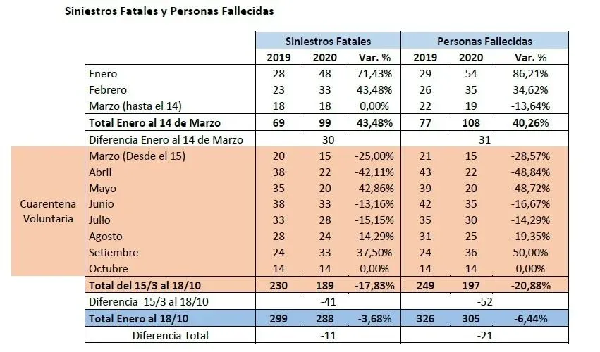 La llegada de la pandemia trajo un pausa en la siniestralidad ya que en los primeros meses, con un escaso movimiento en las calles, entre el 15 de marzo y el 18 de octubre disminuyeron un 17,83% los accidentes fatales (41 menos), y 20,88% los fallecidos (52 menos).
