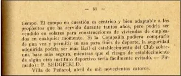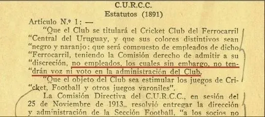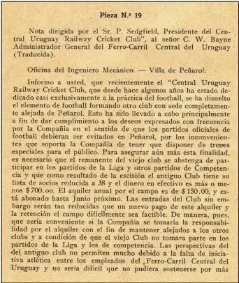 Expresan que en 1939 un comité de asociados de Nacional publicó un folleto sobre el decanato en el que incluyó una carta de abril de 1914, archivada en las oficinas del Ferrocarril Central de Uruguay y escrita por P. Sedgfield, presidente del CURCC, dirigida a C. W. Bayne, administrador del Ferrocarril de Uruguay, en la que indicó: “Informo a usted que recientemente el CURCC, que desde hace algunos años ha estado dedicado casi exclusivamente a la práctica del football, se ha disuelto el elemento football formando otro club con sede completamente alejada de Peñarol”.