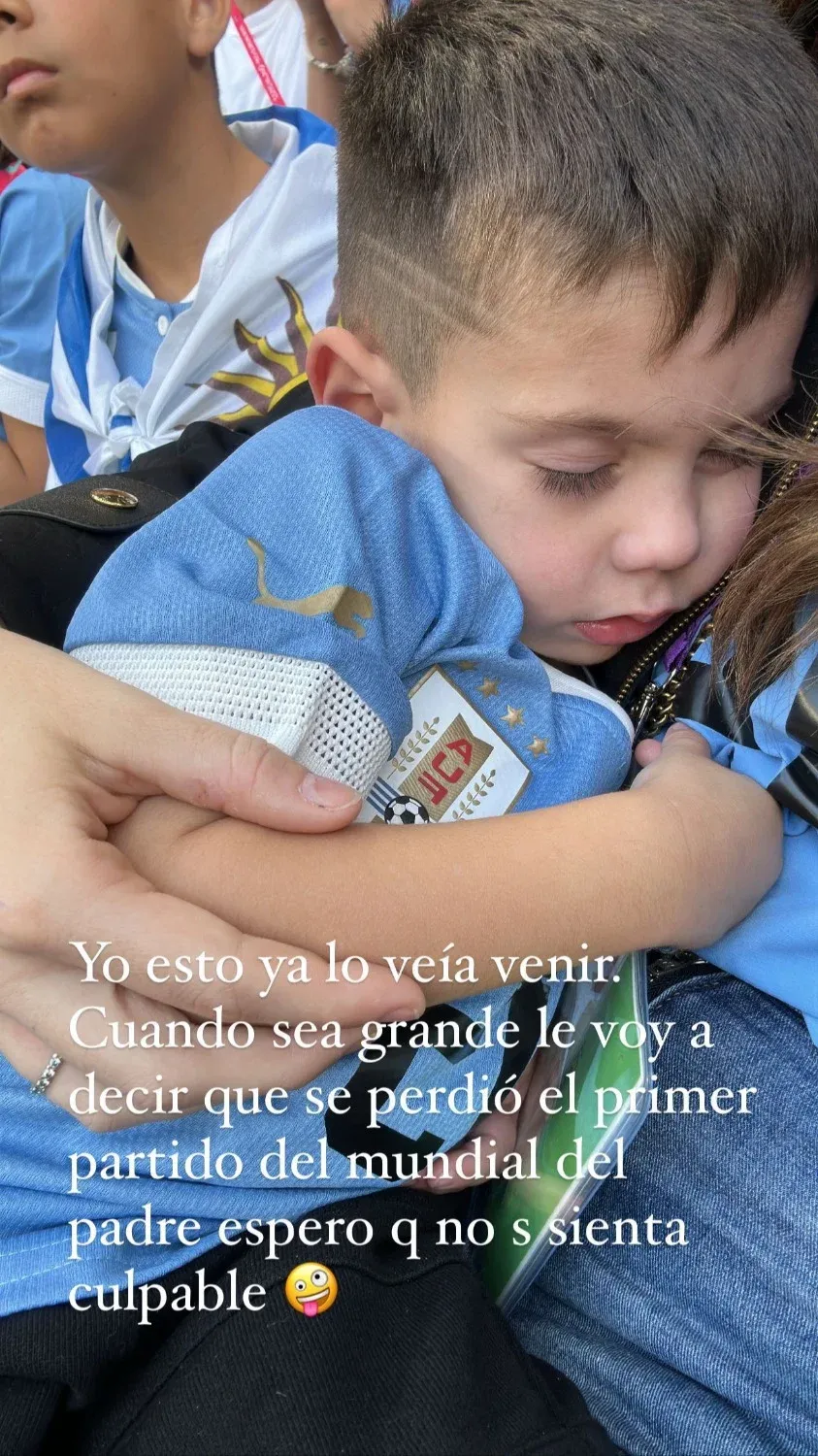 Mina Bonino, la pareja más mediática de los futbolistas uruguayos, contó en Instagram las peripecias que atravesó durante el encuentro. Una de ellas fue que quiso entrar con una bandera al estadio, pero no se lo permitieron porque superaba los dos metros. Según contó, la cortaron en dos partes. También contó que su hijo se durmió en el primer partido.