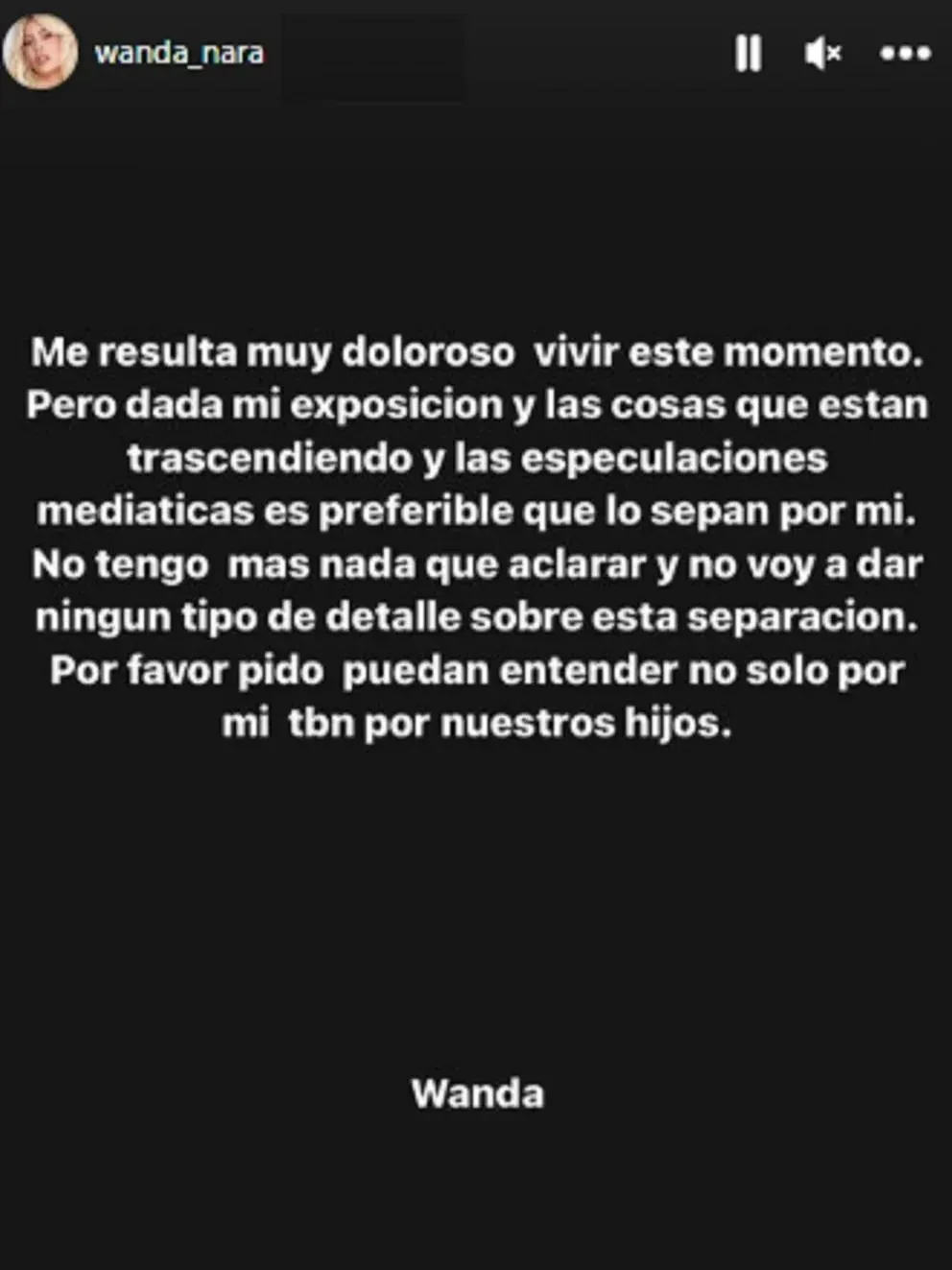 “Me resulta muy doloroso vivir este momento pero dada mi exposición y las cosas que están trascendiendo y las especulaciones mediáticas es preferible que lo sepan por mí. No tengo más nada que aclarar y no voy a dar ningún tipo de detalle sobre esta separación. Por favor pido puedan entender no solo por mí, también por nuestros hijos”, escribió antes de borrar todas las fotos en las que aparecía con el futbolista de su cuenta de Instagram.