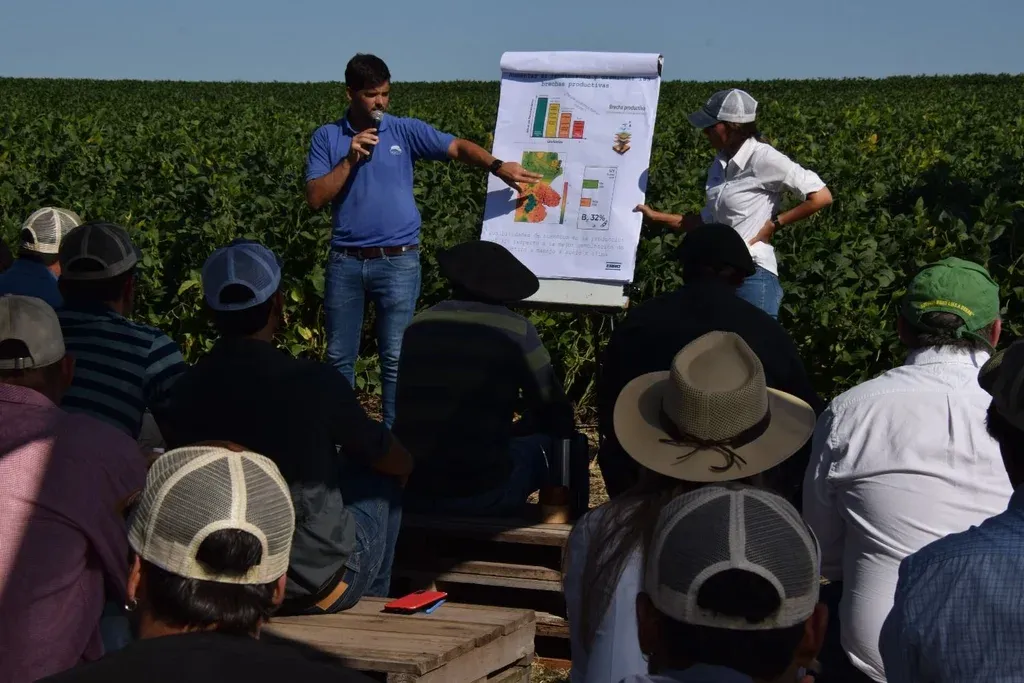 Juan Samuelle Ver nuevas sojas en ensayos bien de cerca, una de las posibilidades. Parada 2: Reduciendo las brechas productivas en soja. “Vimos mucha información generada sobre la brecha entre el potencial de rendimiento y los rindes promedio a nivel país, que es de 32% a 33%. Tenemos mucho potencial para acortar eso, para subir promedios. Se mostraron por parte de los equipos de Erro y de Don Mario variables al alcance del productor para ajustar esa brecha”.