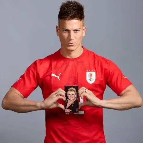 En la imagen que compartió en sus redes este martes se lo ve con el equipo rojo de Uruguay y con una foto de su madre en sus manos, formando un corazón con sus dedos.