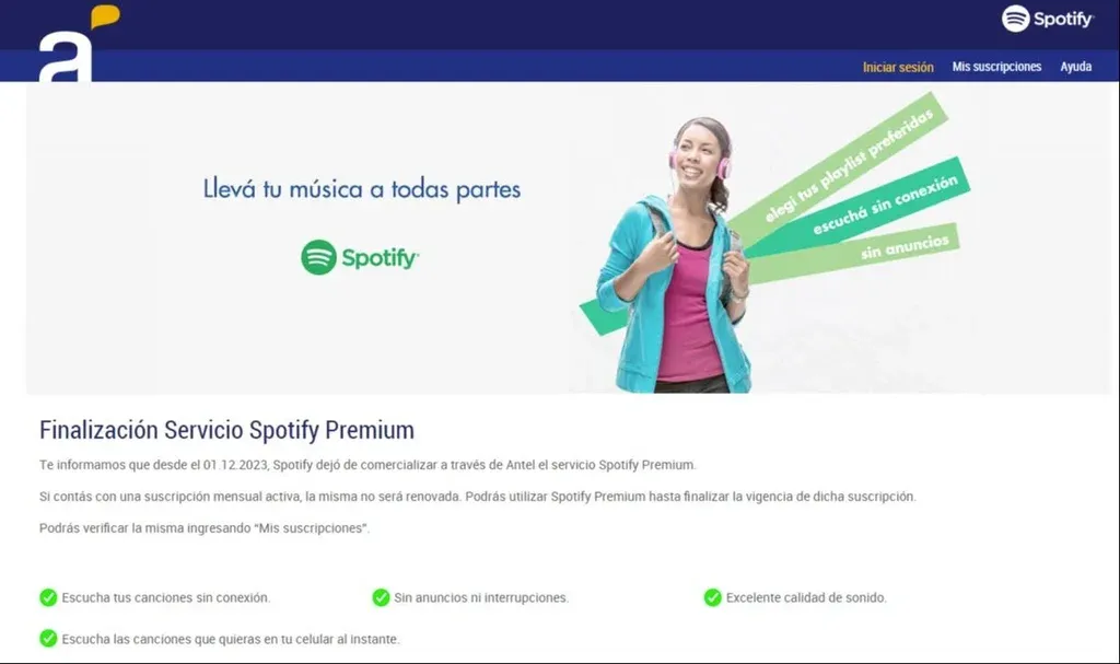 En la web de Antel, en tanto, la información se reitera con otra comunicación similar: "Te informamos que desde el 01.12.2023, Spotify dejó de comercializar a través de Antel el servicio Spotify Premium. Si contás con una suscripción mensual activa, la misma no será renovada. Podrás utilizar Spotify Premium hasta finalizar la vigencia de dicha suscripción."