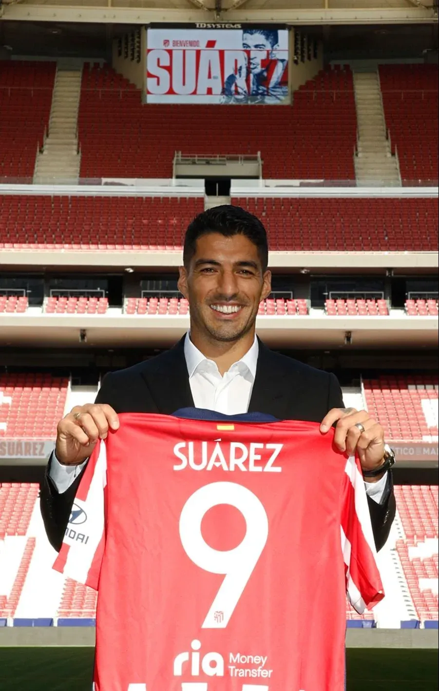 Atlético de Madrid De impecable traje y camisa, Suárez se sacó la tradicional foto mientras estampaba la firma del contrato y luego fue al césped del Wanda para posar junto al presidente del club madrileño, Enrique Cerezo, y con su nueva casaca. El salteño seguirá usando el número 9, la que tenía Álvaro Morata, quien se fue a Juventus.