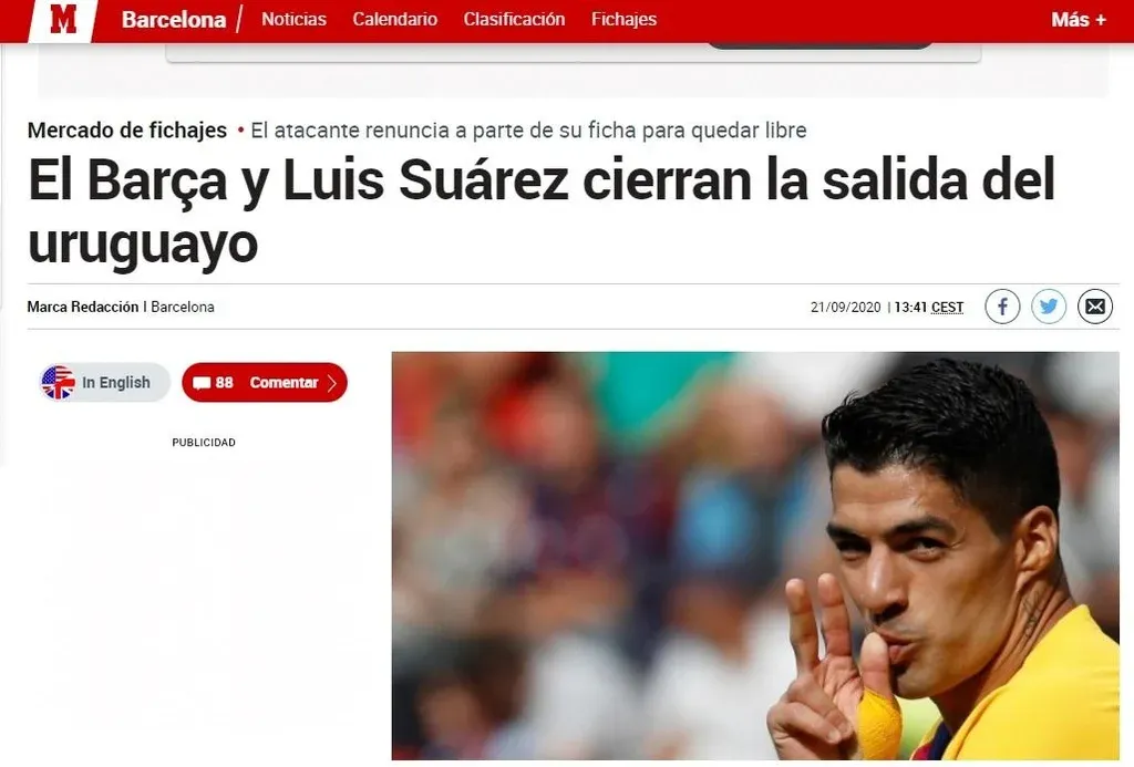 El diario Marca, tomando información de radio RAC1, dice: “Suárez se va libre del Camp Nou. Pero para ello ha tenido que renunciar a una parte de la ficha de la temporada 20-21. De esta manera, al Barça no ingresará dinero, pero se ahorrará una cantidad destacada de su sueldo”.