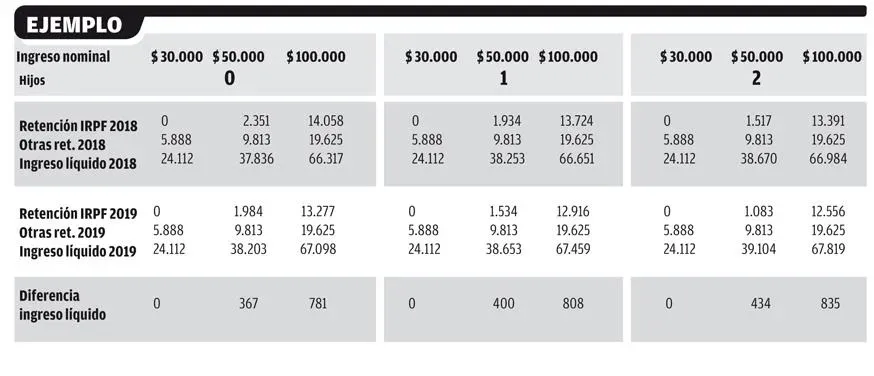 Así, el mínimo no imponible del IRPF (7 BPC) trepará de $ 26.936 nominales mensuales a $ 29.078 para 2019. Sin embargo, ese monto no tiene en cuenta las deducciones que se calculan para el pago de ese tributo (Fonasa, aportes jubilatorios, Fondo de Reconversión Laboral, entre otros). Según cálculos realizados por El Observador, para un trabajador sin hijos a cargo y que paga solo Fonasa para él, el mínimo no imponible de IRPF subirá de $ 33.500 a $ 36.100 nominales a partir de este año.